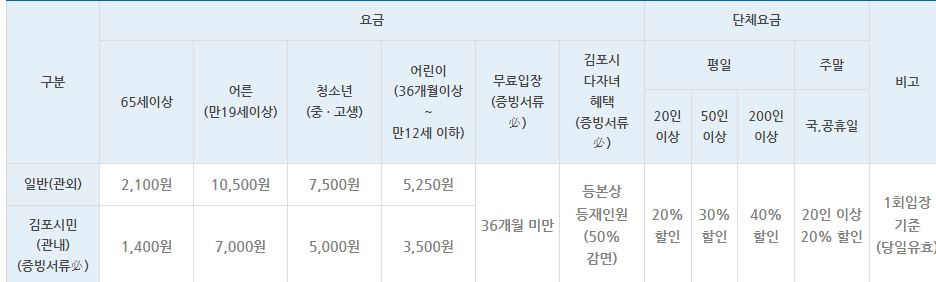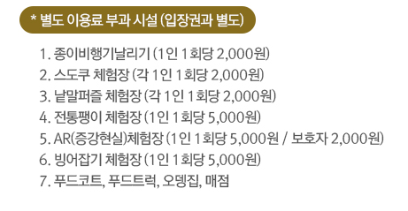| 무료입장 | 24개월 미만, 만 65세 이상(시설 이용료는 유료) | ||