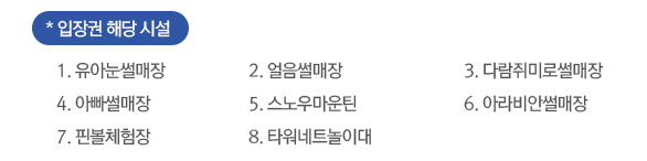 | 눈썰매장 (소인,대인) | 눈썰매장 단체(소인,대인) | 썰매장+눈 놀이입장료(소인,대인) | 눈썰매장+눈 놀이입장료(단체) | 눈썰매장+눈 놀이장입장료+놀이기구2종 | 눈썰매장+놀이입장료+놀이기구2종 단체 | 눈썰매장+눈 놀이입장료+기구2종+빙어 | 눈썰매장+입장료+기구2종+빙어 단체 | 짚라인(몸 무게, 키 제안 있음) | 눈놀이장 입장료 |