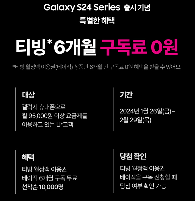 갤럭시 S24 사전예약 출시기념으로 월 95,000원이상 요금제를 이용하는 분들을 대상으로 2024년 1월 26일부터 2월 29일까지 티빙 월정액 이용권 베이직을 구독하면 6개월 동안 무료로 이용할 수 있습니다. 선착순 10000명만 받을 수 있는 혜택이니 구독하고 마음껏 유료로 감상하세요.