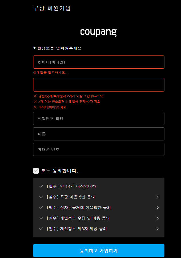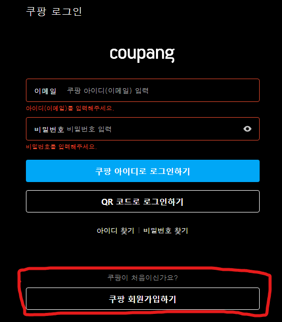 2. 쿠팡 로그인 팝업 내 [쿠팡 회원가입하기] 버튼 클릭