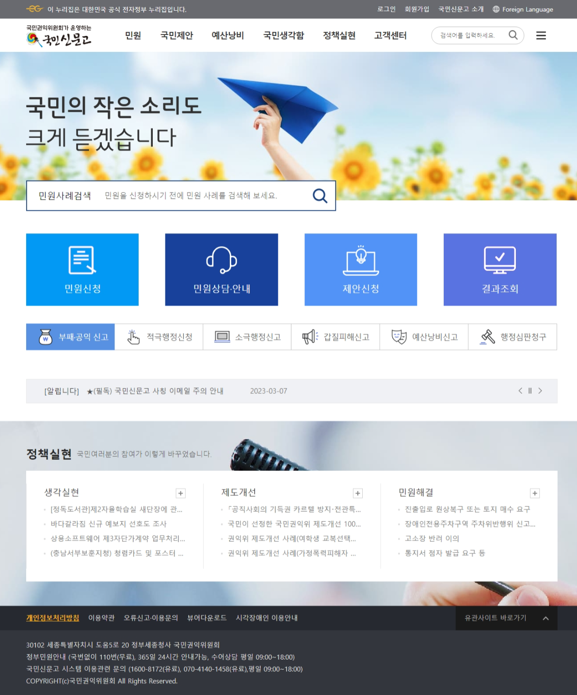 국민신문고는 대한민국 국민권익위원회가 운영하는 온라인 국민참여포털입니다. 국민이 정부에 대한 민원·제안·참여 등을 인터넷으로 간편하게 신청하고 처리하는 범정부 대표 온라인 소통 창구입니다.