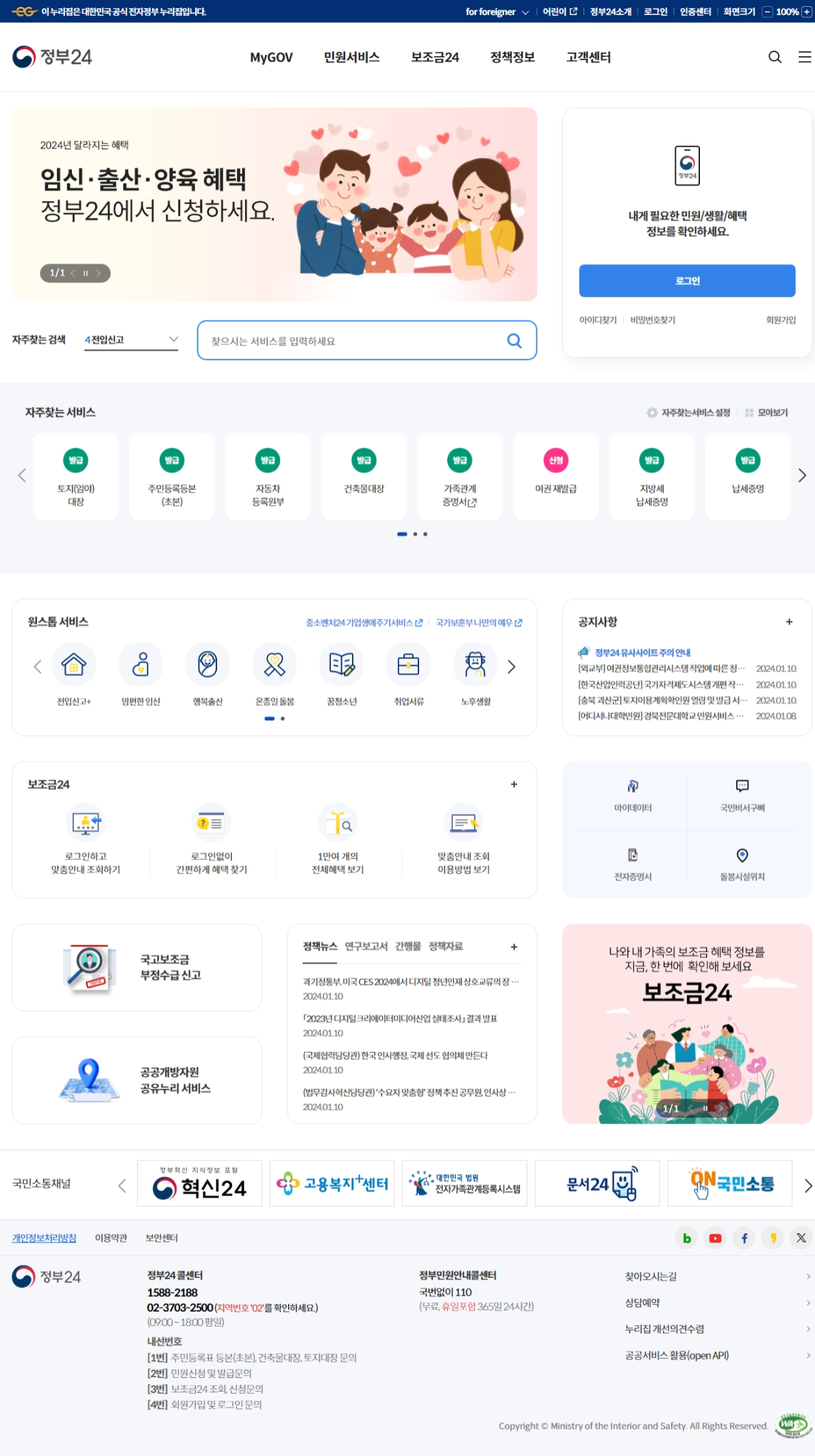 정부24는 대한민국 정부의 대표적인 종합포털 사이트입니다. 국민들이 일상생활에서 겪는 다양한 민원과 행정서비스를 편리하게 이용할 수 있도록 지원하며, 회원가입 및 간편인증을 통해 이용할 수 있습니다.