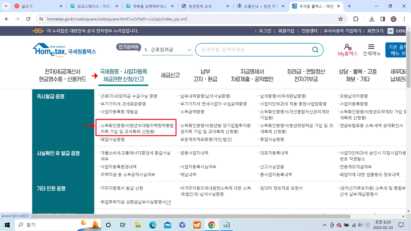 우선 청년들 중 일반 직장인이라면 내 소득을 확인할 소득확인 증명서와 원천징수영수증이 필요합니다. 홈텍스에서 무료로 발급 가능하구요.