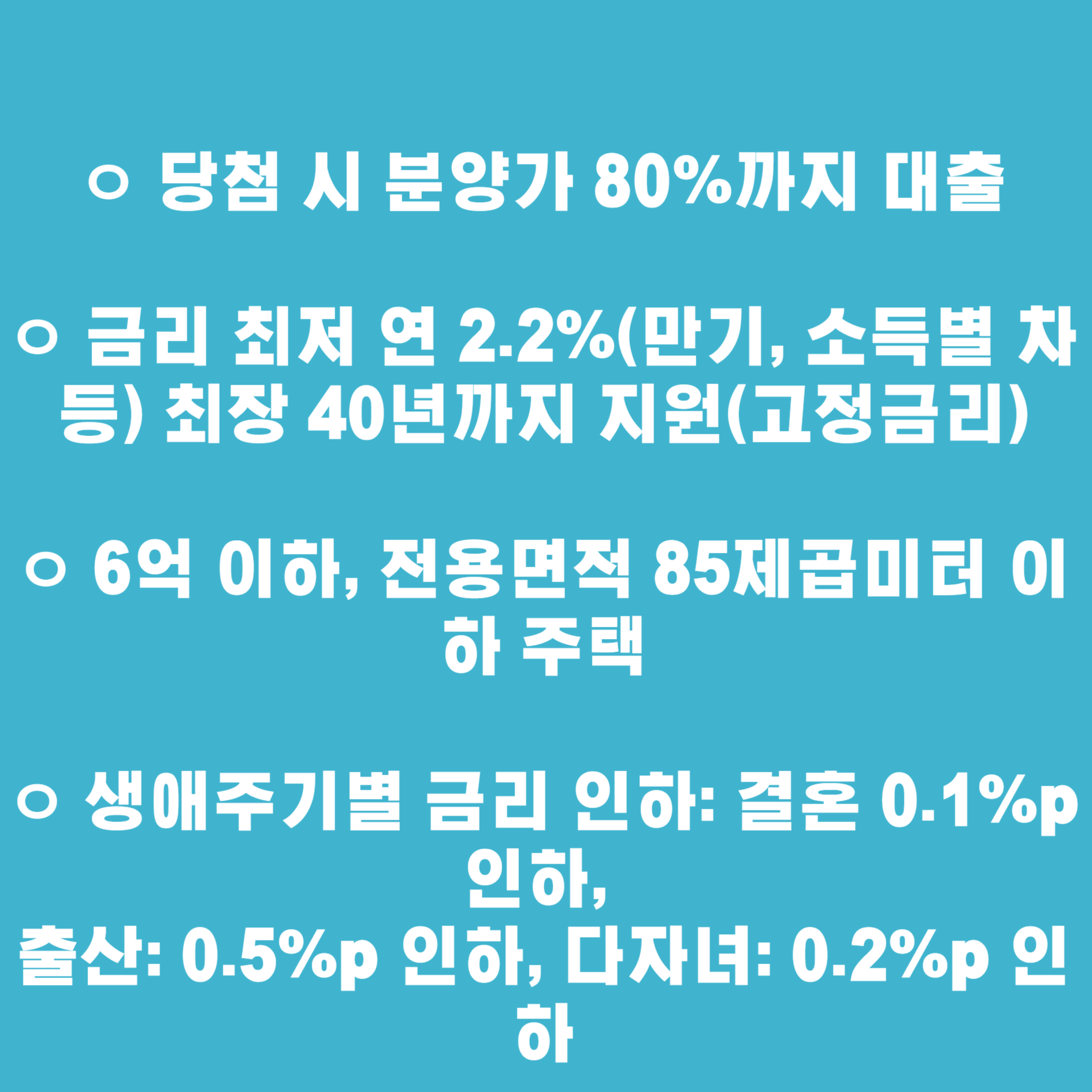 ㅇ 금리 최저 연 2.2%(만기, 소득별 차등) 최장 40년까지 지원(고정금리)
