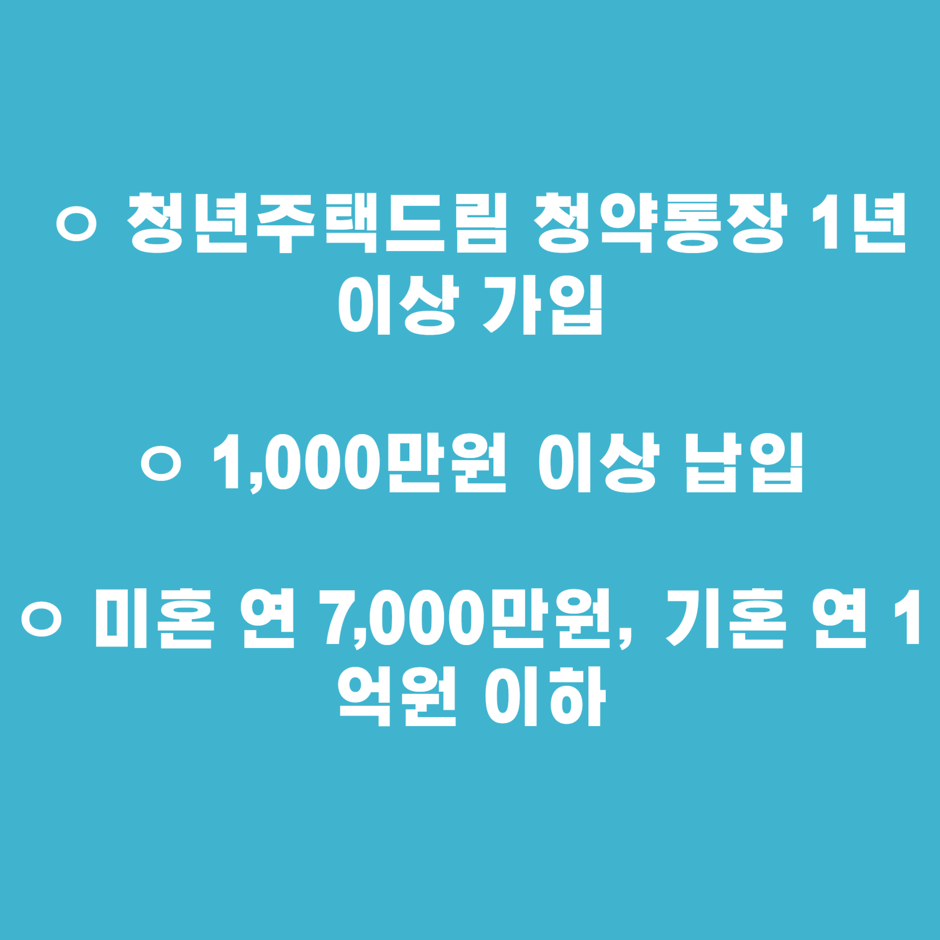 청년주택드림 청약통장을 개설하고 최소 1년 이상에 1000만원 이상 납입을 해야 하구요. 결혼을 안한 청년은(군복무자 포함) 연소득 7000만원 이하, 결혼한 청년은 연소득 1억원 이하여야 합니다.
