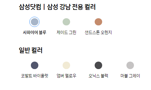 총 7가지의 색상이 있으며 강남전용컬러는 삼성닷컴을 통해서만 정할 수 있고 나머지는 일반컬러로 사전예약을 해야합니다.