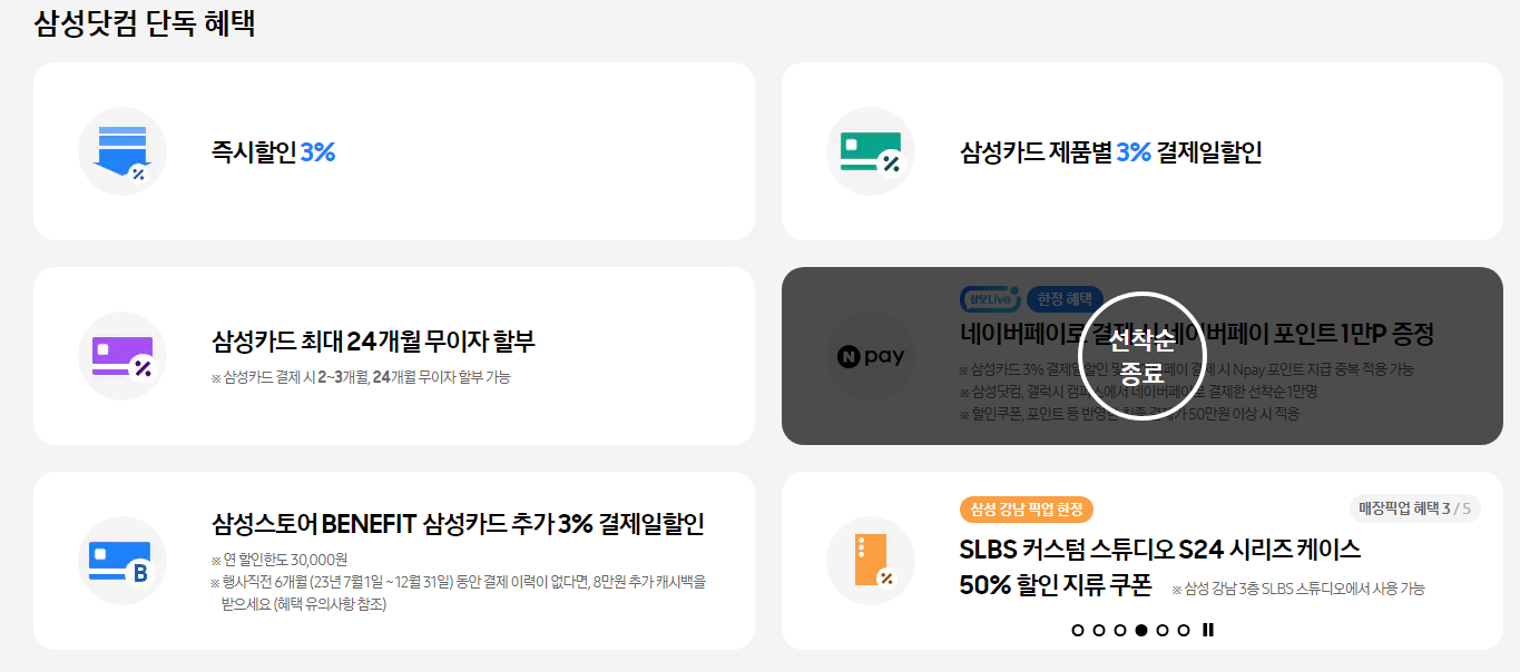 삼성카드로 결제시 즉시할인 3%와 제품별로 3%를 결제일때 할인해줍니다. 총 6%를 받을 수 있으니까 최소 70,055원에서 최대 103,429원까지 할인을 받을 수 있습니다. 그리고 최대 24개월로 무이자할부를 지원합니다.