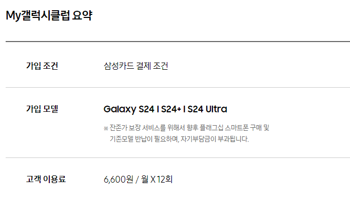 쉽게 말하자면, 월 6600원씩 12개월 이용료를 지불하고 1년 뒤에 새로운 폰으로 업그레이드를 할 수 있습니다. 삼성카드로 결제를 해야하는 조건이 붙으며 이번에 출시된 S24 모델을 대상으로 가입을 합니다.