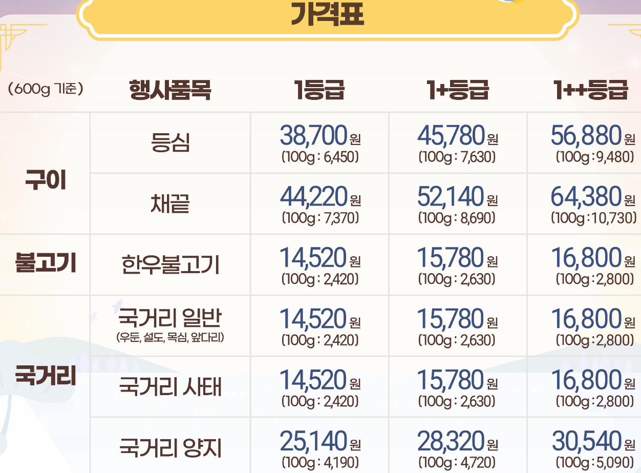 ◎등심= 1등급:38,700원, 1+등급: 45,780원, 1++등급: 56,880원