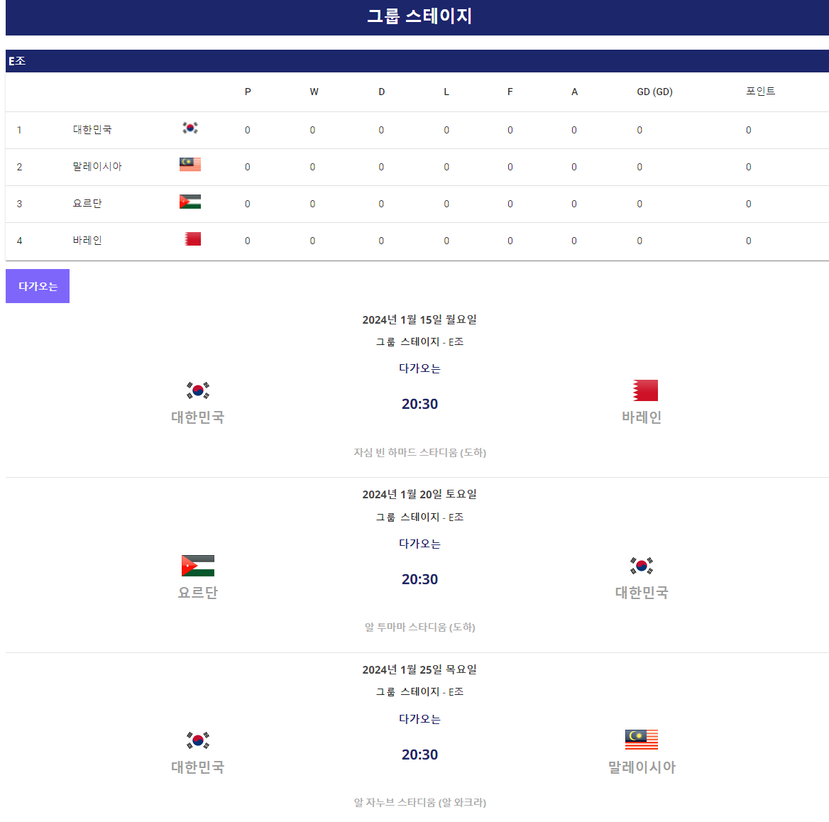| 조별리그 E조 | 01.15(월) 20:30 | 대한민국 vs 바레인 요르단 |