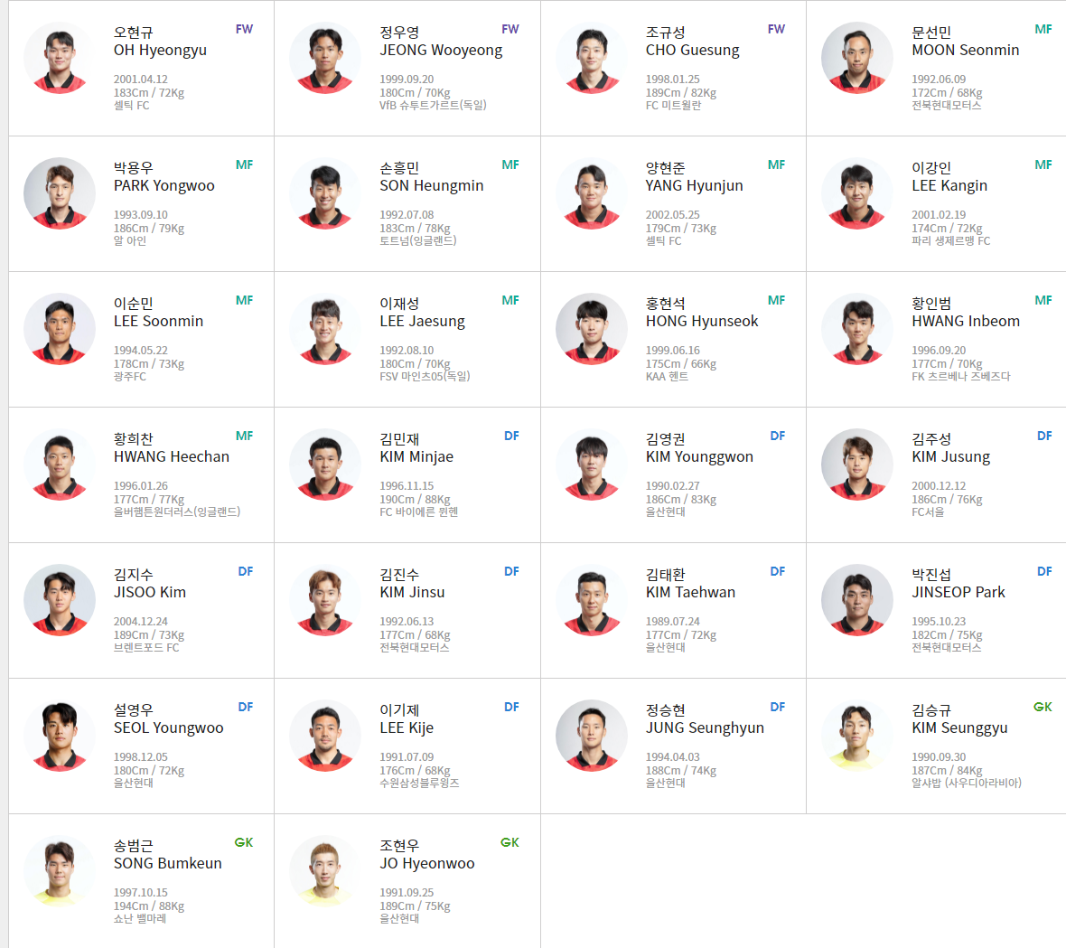 문선민, 박용우, 손흥민, 양현준, 이강인, 이순민, 이재성, 홍현석, 황인범, 황희찬